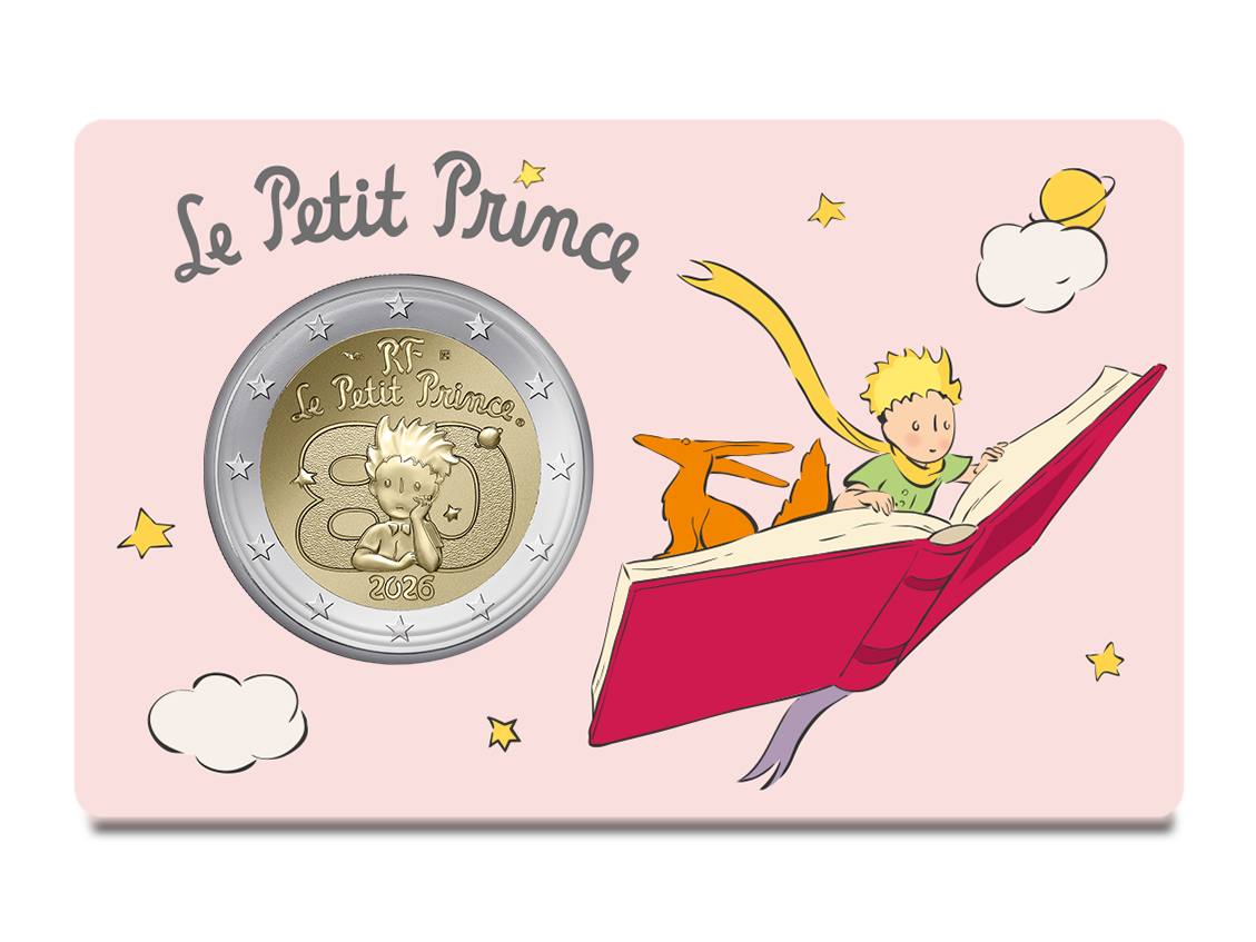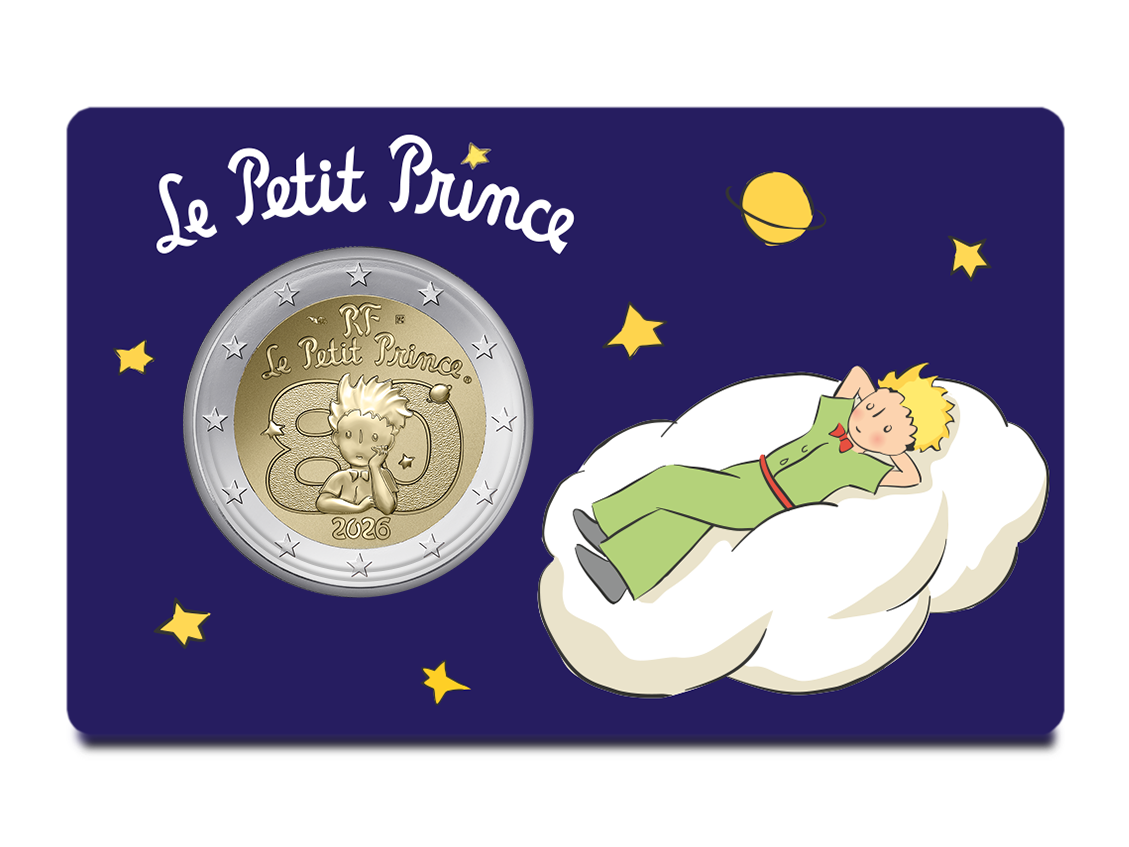 The commemorative 2 euro coin celebrating The Little Prince is offered in BU Brilliant Uncirculated quality from January 29, presented in a sealed coin card. Four versions are available, each struck in 75,000 examples, priced at 12 euros, with a diameter of 25.75 mm and a weight of 8.5 g.
