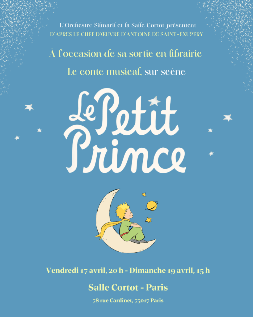 À l’occasion des 80 ans de sa publication française, et en partenariat avec Gallimard Jeunesse, Le Petit Prince revient sur scène sous la forme d’un conte musical poétique et immersif ! Porté par une troupe de jeunes comédiens-chanteurs et l’Orchestre Silmaril, composé de seize musiciens, le spectacle offre une rencontre unique entre théâtre, chant et musique classique.