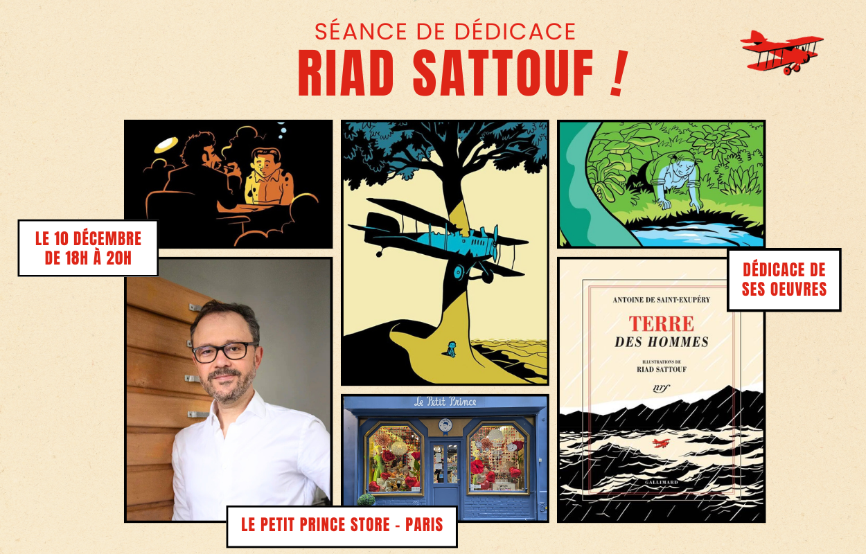 À l’occasion de la parution de l’édition illustrée de Terre des hommes d’Antoine de Saint-Exupéry, le dessinateur Riad Sattouf rencontrera ses lecteurs lors d’une séance de dédicaces* exclusive mercredi 10 décembre 2025 de 18 h à 20 h au Petit Prince Store – Paris.